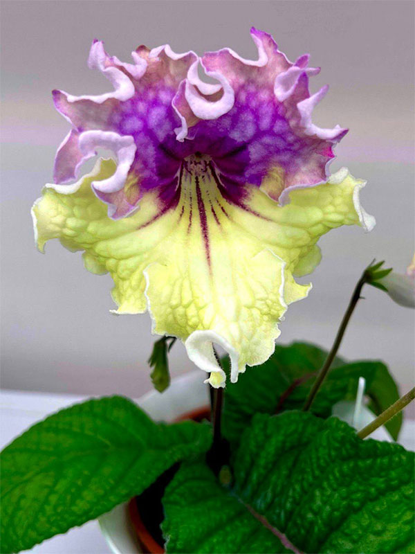 Очень крупные цветы, нижние лепестки - ярко-желтые, контрастные, из горла выходит один фиолетовый лучик и четыре более светлых покороче. Верхние лепестки фиолетовые с едва заметным сетчатым рисунком, иногда на фиолетовом проступает жёлтый пигмент. Горло затемнённое. Край лепестков резной. Цветоносы очень короткие, крепкие. Структура лепестков плотная, розетка небольшая.